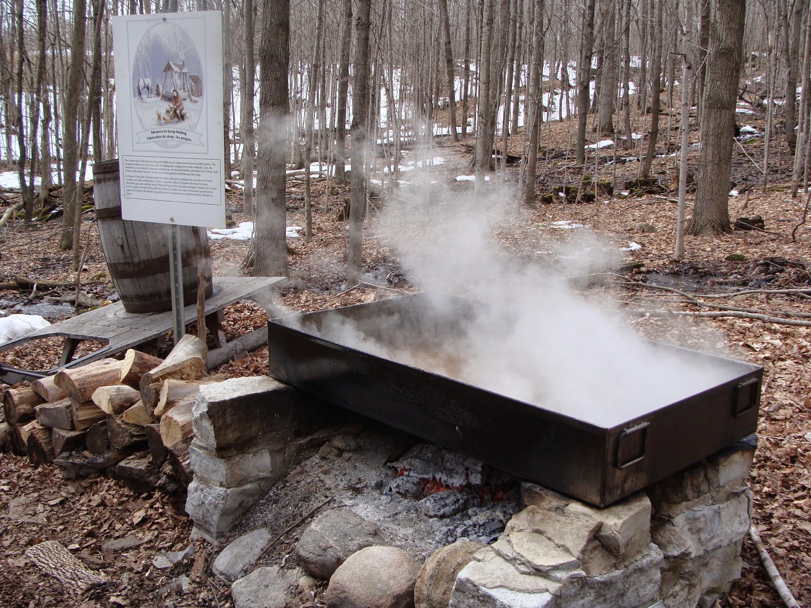 On Sunday, we all met again and traveled to the Cataraqui Regional Conservation Authority's nature preserve to visit their Syrup and Pancake Festival. They have created a tour on site that chronicles the full history of sap gathering... from the First People's methods right up to the present day steam pan production.